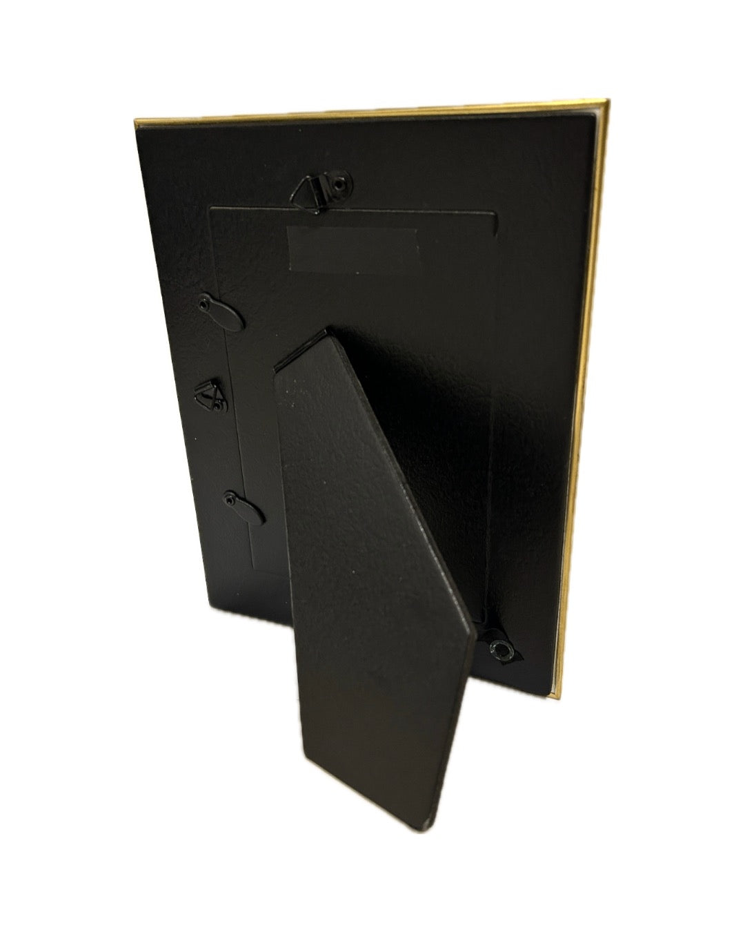 ゴールドエッジをあしらった段差のあるマットボード付き細いメタル製フォトフレームで額装済み。